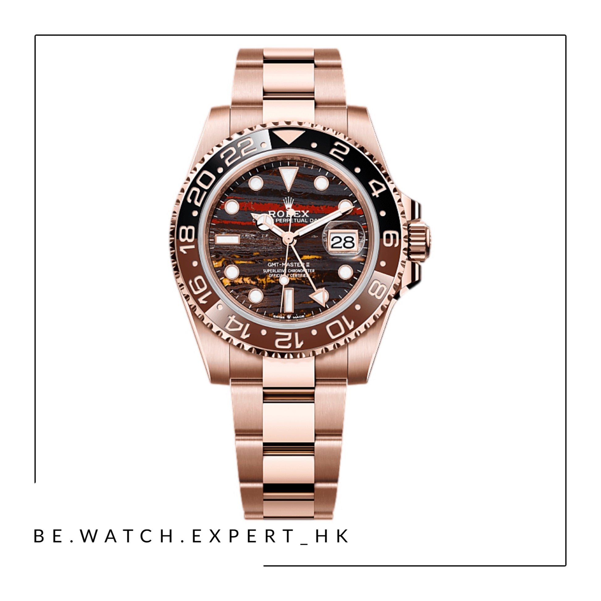 18K永恒玫瑰金款,搭配鐵虎眼石錶面及蠔式(Oyster)錶帶