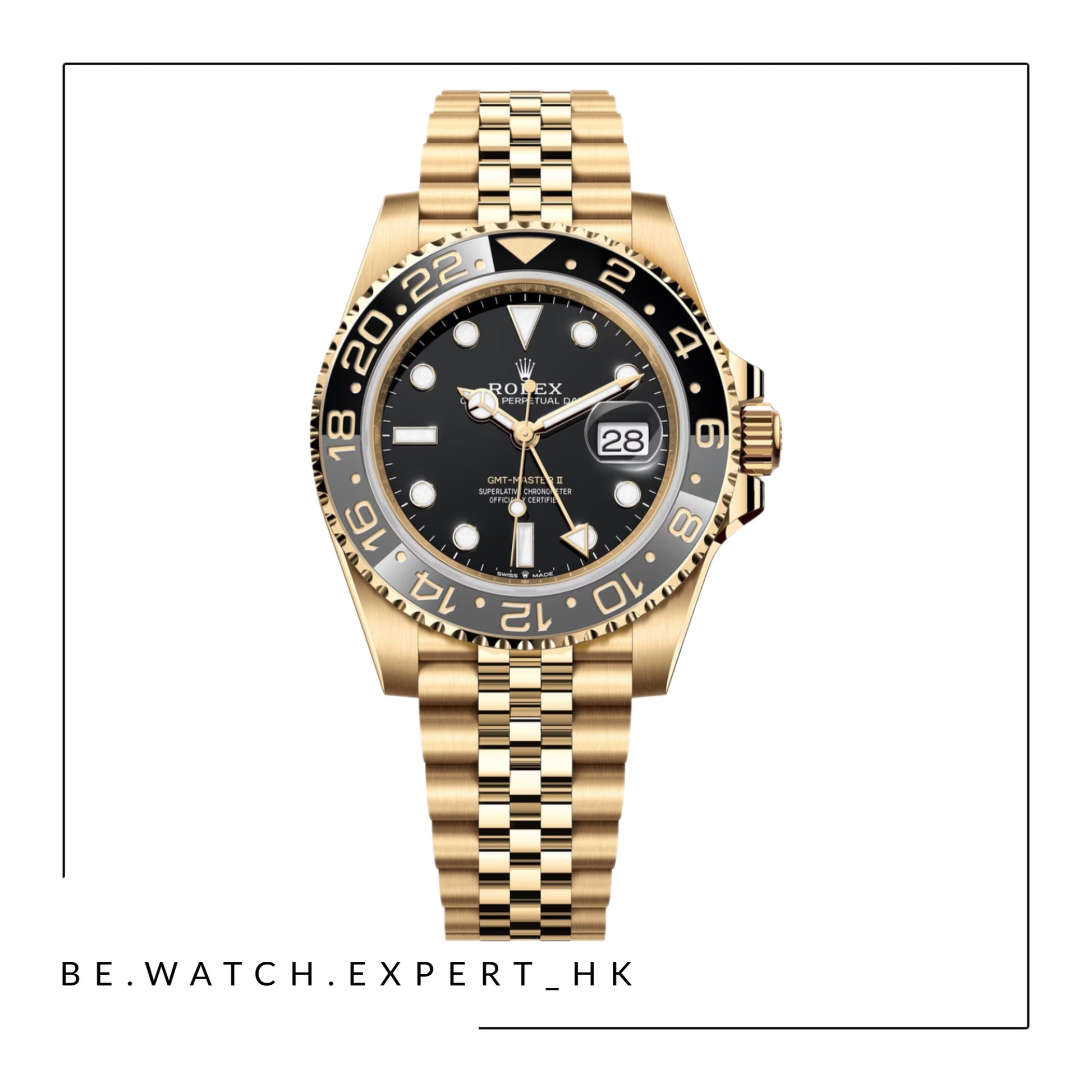 18K黃金款,搭配黑色錶面及紀念型(Jubilee)錶帶