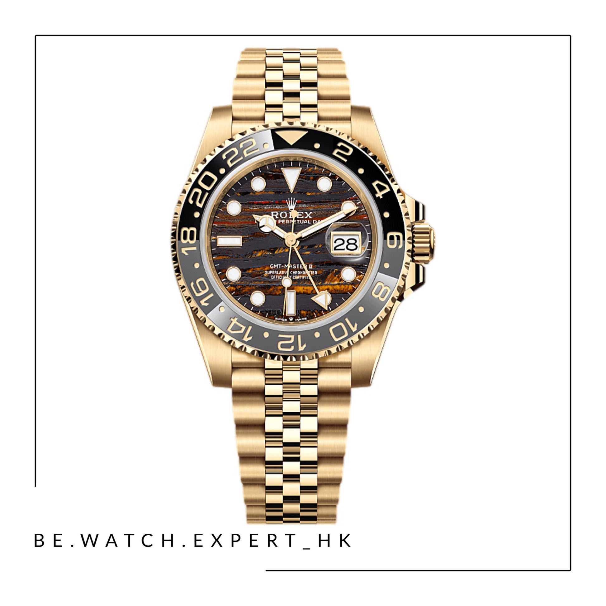 18K黃金款,搭配鐵虎眼石錶面及紀念型(Jubilee)錶帶