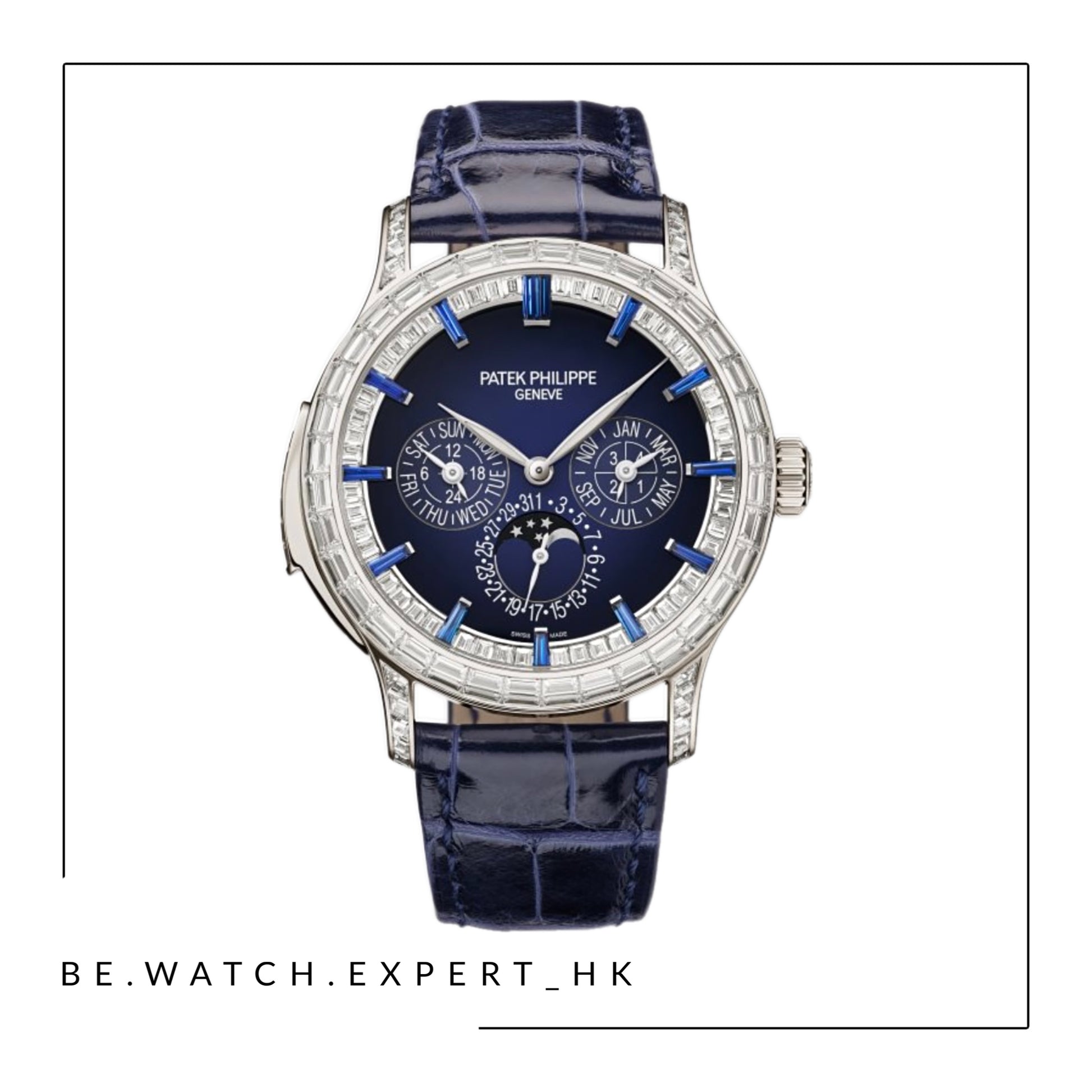 •Blue-lacquered dial, black-gradient rim, sapphire hour markers and diamond minute markers
