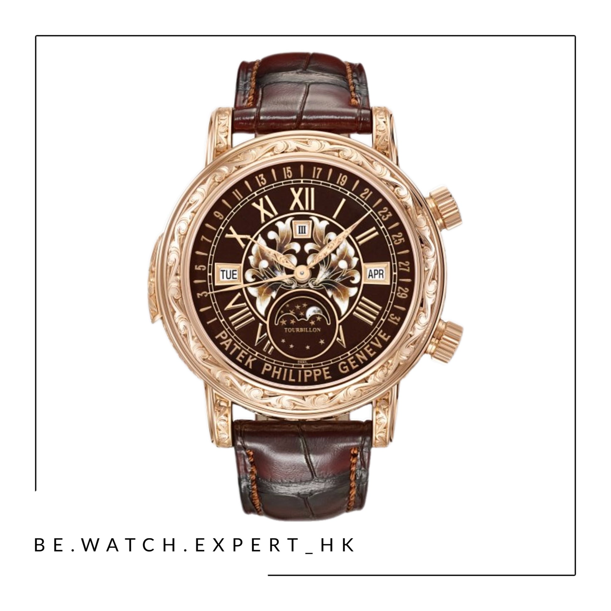 Front side: Perpetual calendar with retrograde date hand. Day, month, leap year in apertures. Hours and minutes of mean solar time. Moon phases.