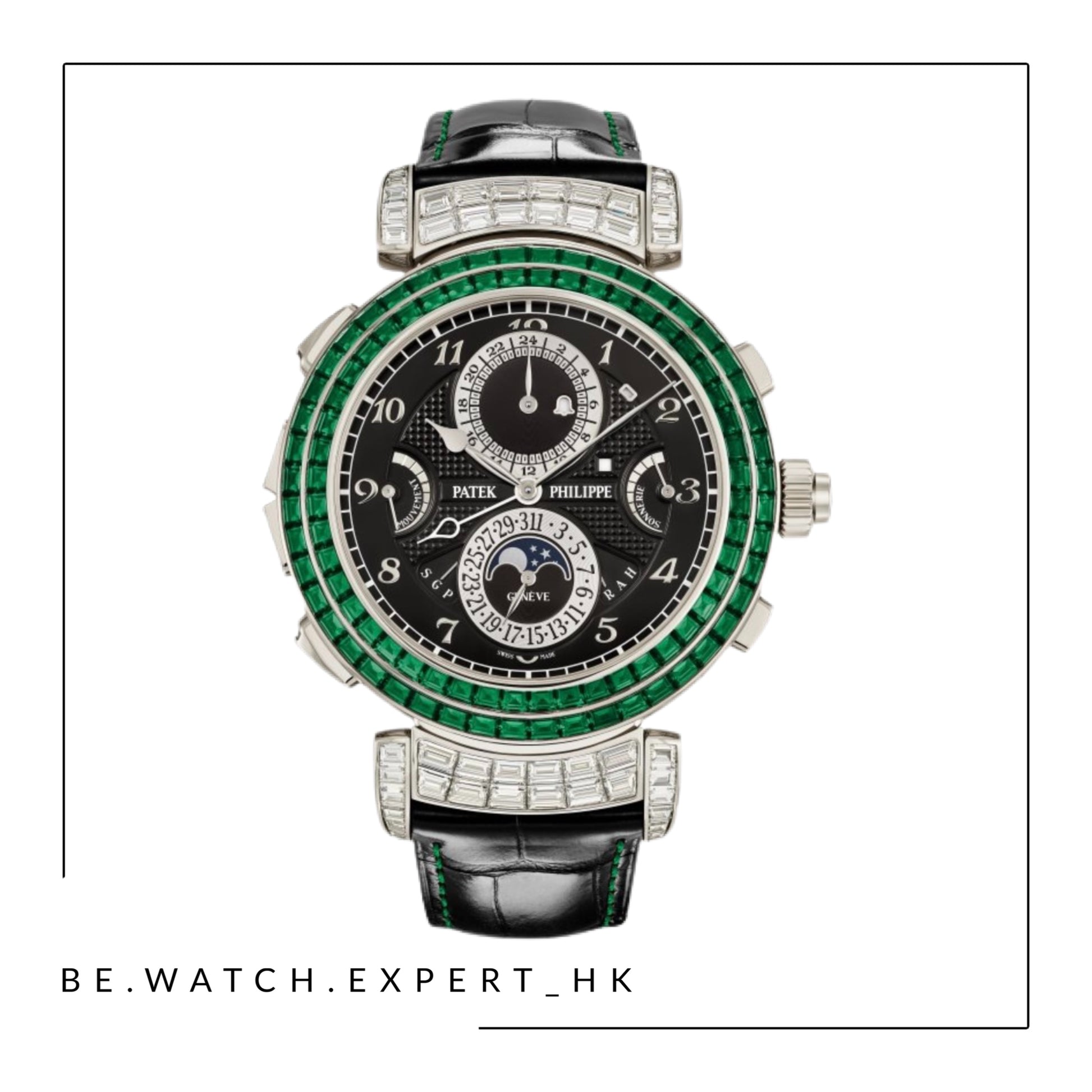 • Grande and petite sonnerie. Minute repeater with classic gongs. Strikework mode display (S G P). Alarm with time strike. Alarm on/off indication. Date repeater. Movement and strikework power-reserve indication. Strikework isolator indication. Second time-zone. Second time zone day/night indication. Instantaneous perpetual calendar. Day, date (on both dials), month, leap-year cycle by hands. Four-digit year display in an aperture. Moon phases. 24-hour and minutes subdial. Crown position indication (R A H).