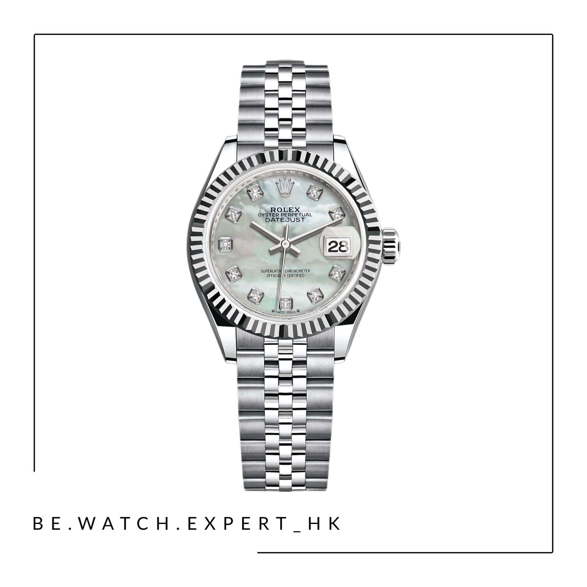 白色黃金及蠔式鋼款,搭配鑲鑽白色珍珠母錶面及紀念型(JUBILEE)錶帶