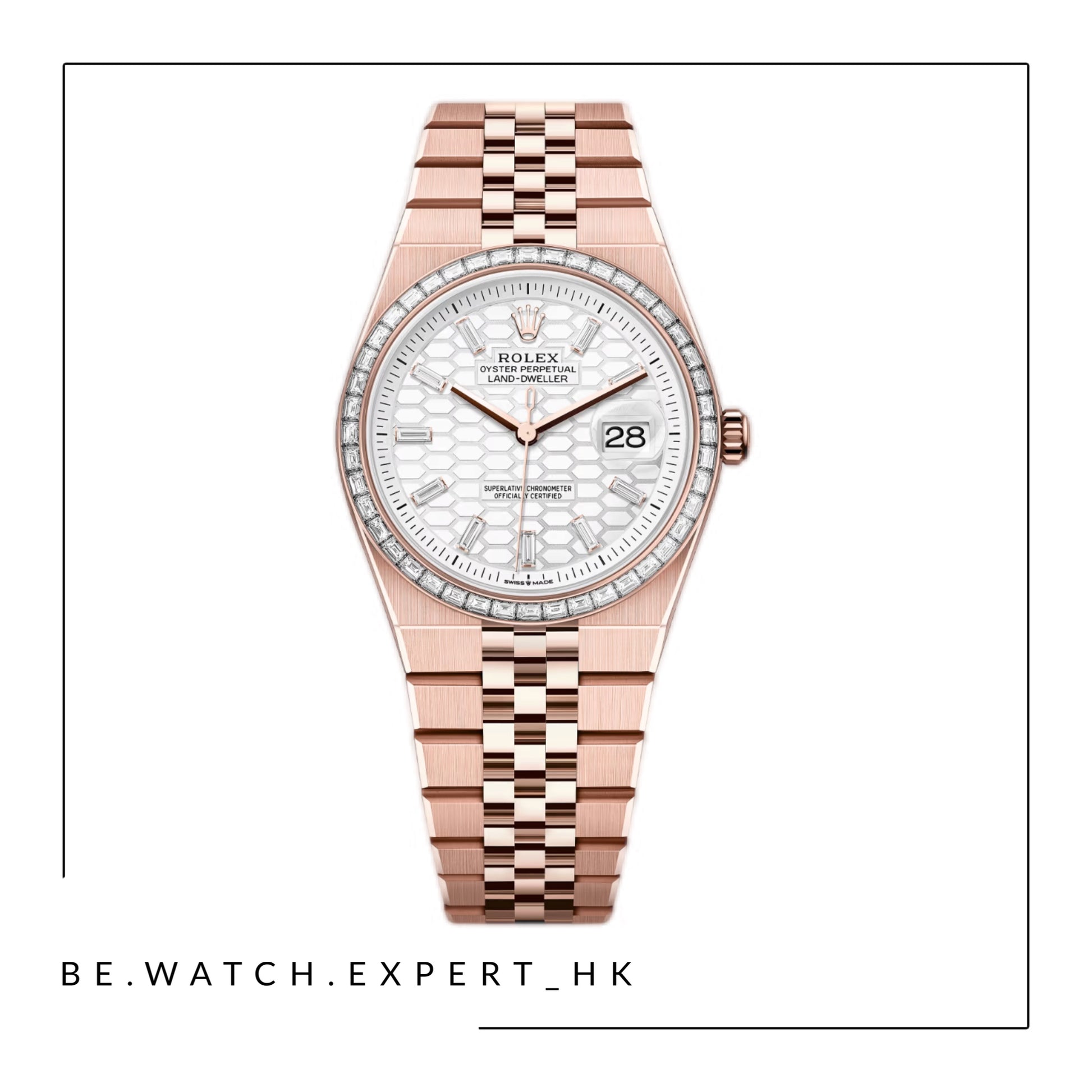 18K永恒玫瑰金款,搭配醇白色蜂巢圖案鑲鑽錶面及纖薄紀念型(Flat Jubilee)錶帶