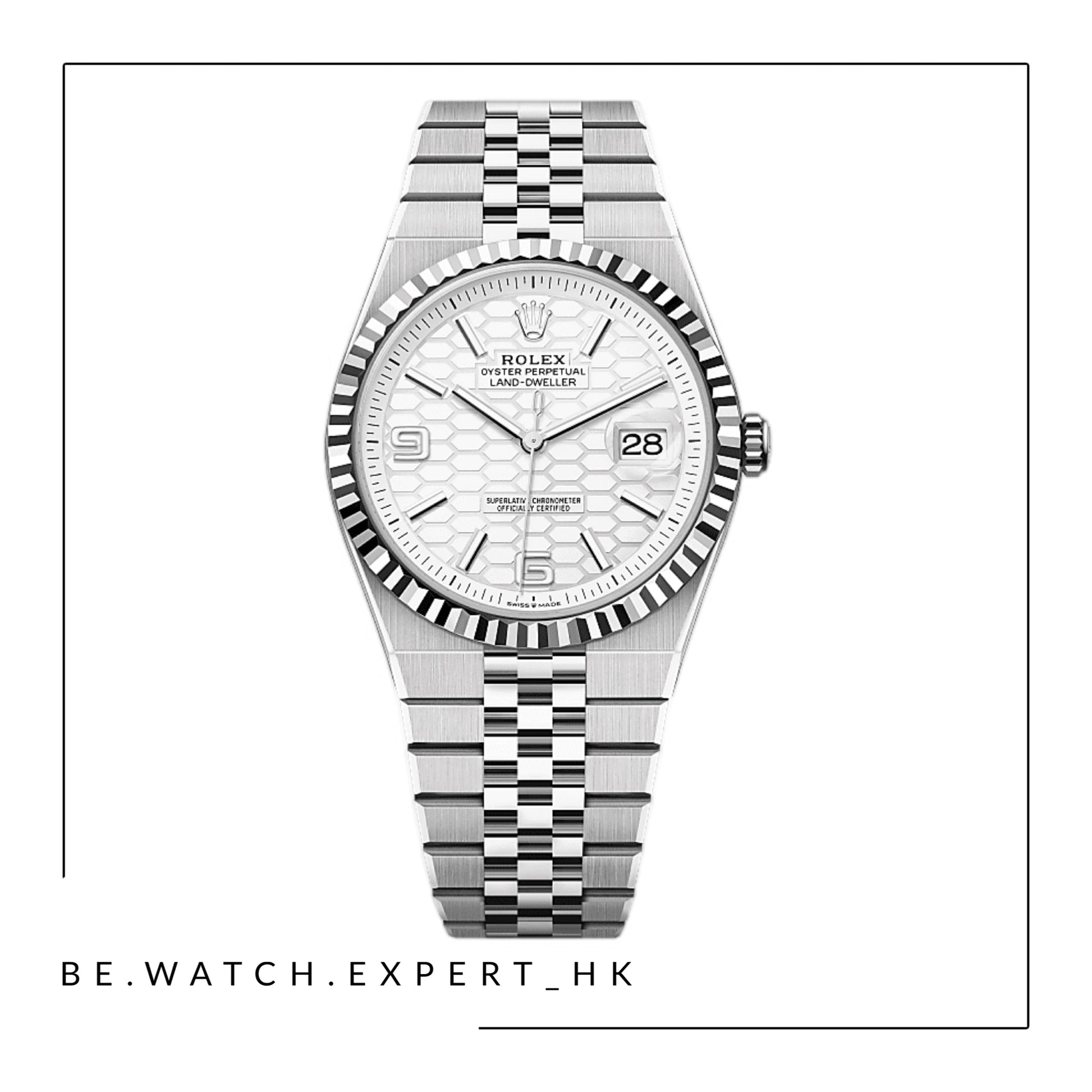 白色黃金及蠔式鋼款,搭配醇白色蜂巢圖案錶面及纖薄紀念型(Flat Jubilee)錶帶