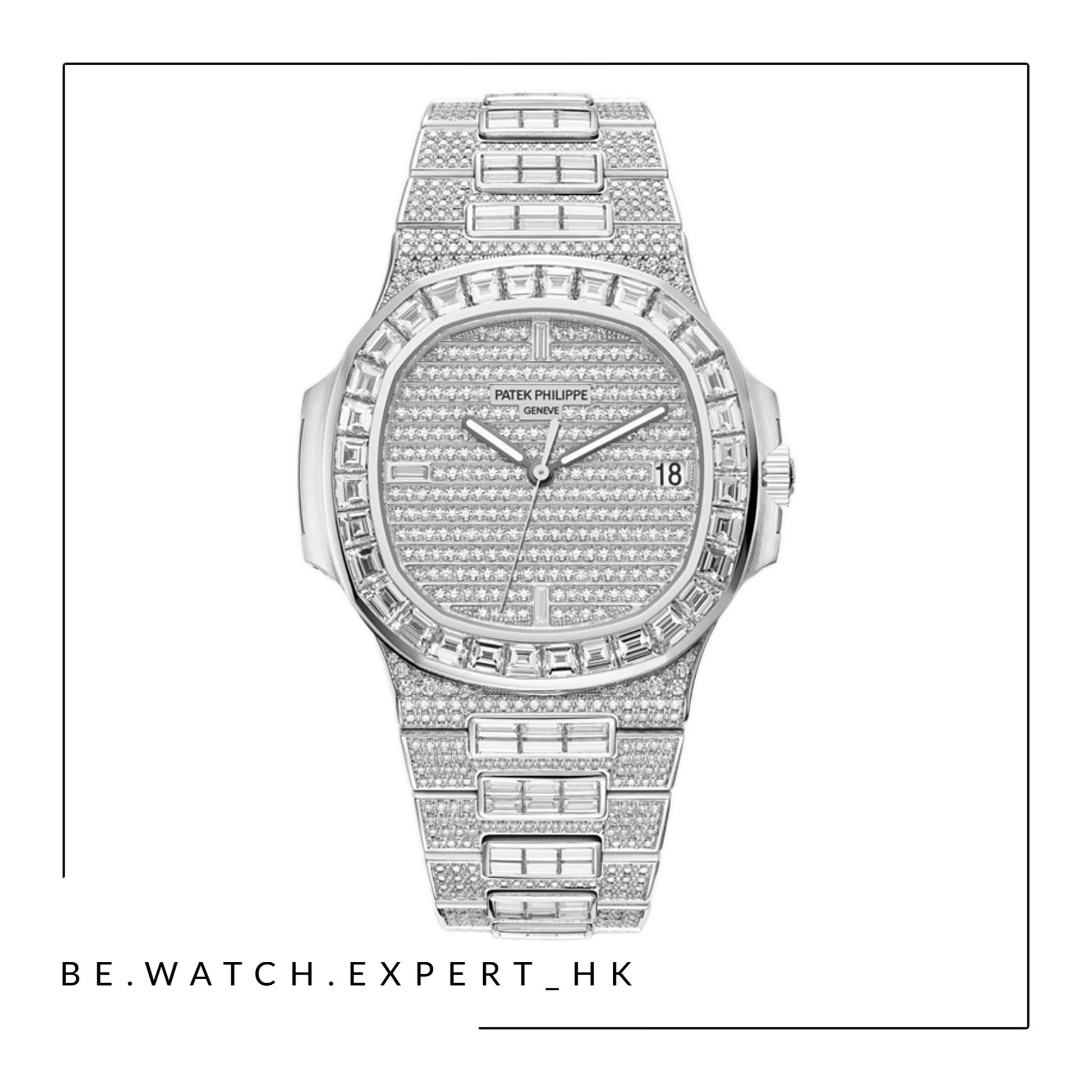 Case: 100 diamonds: ~0.69 ct. and 32 baguette diamonds: ~5.51 ct. Dial: fully set with 255 diamonds (~1.36 ct) and 3 baguette diamond hour markers (~0.01 ct). Bracelet: 803 diamonds: ~3.55 ct. and 150 baguette diamonds: ~7.52 ct. Total 1,343 diamonds: ~18.73 ct.
