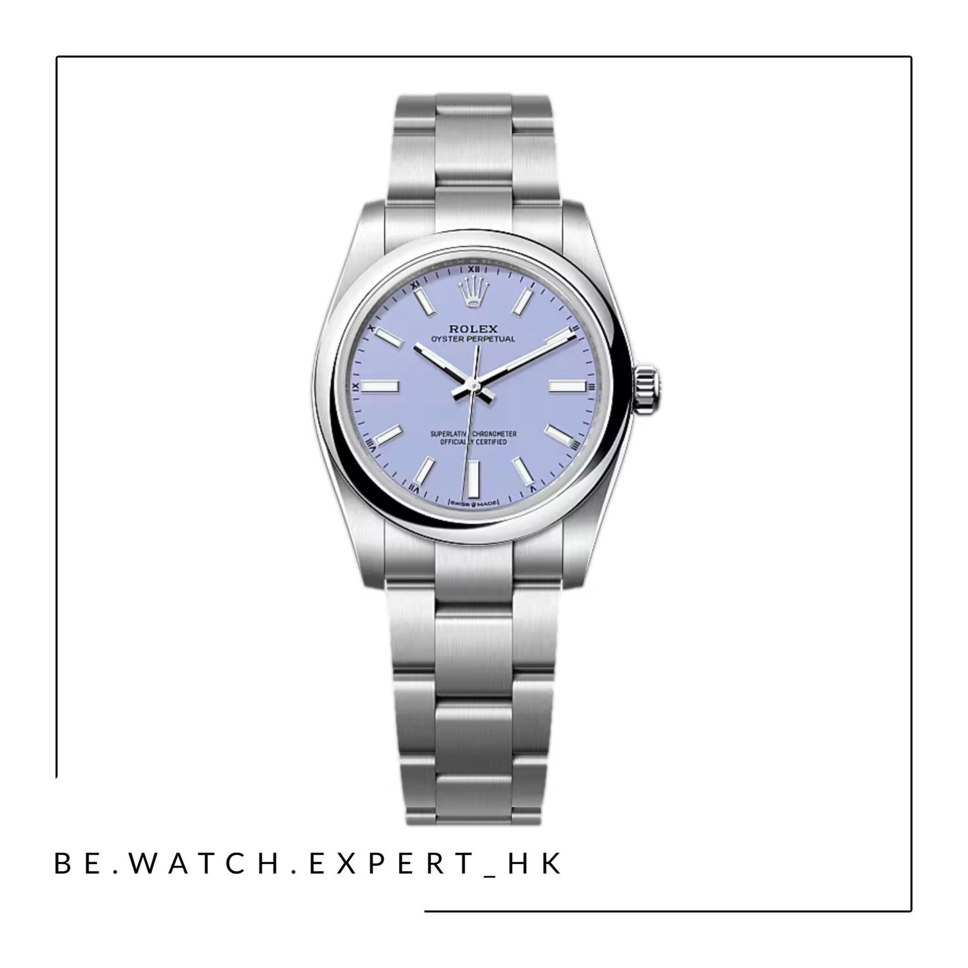 腕錶搭配薰衣草紫色錶面及蠔式(Oyster)錶帶