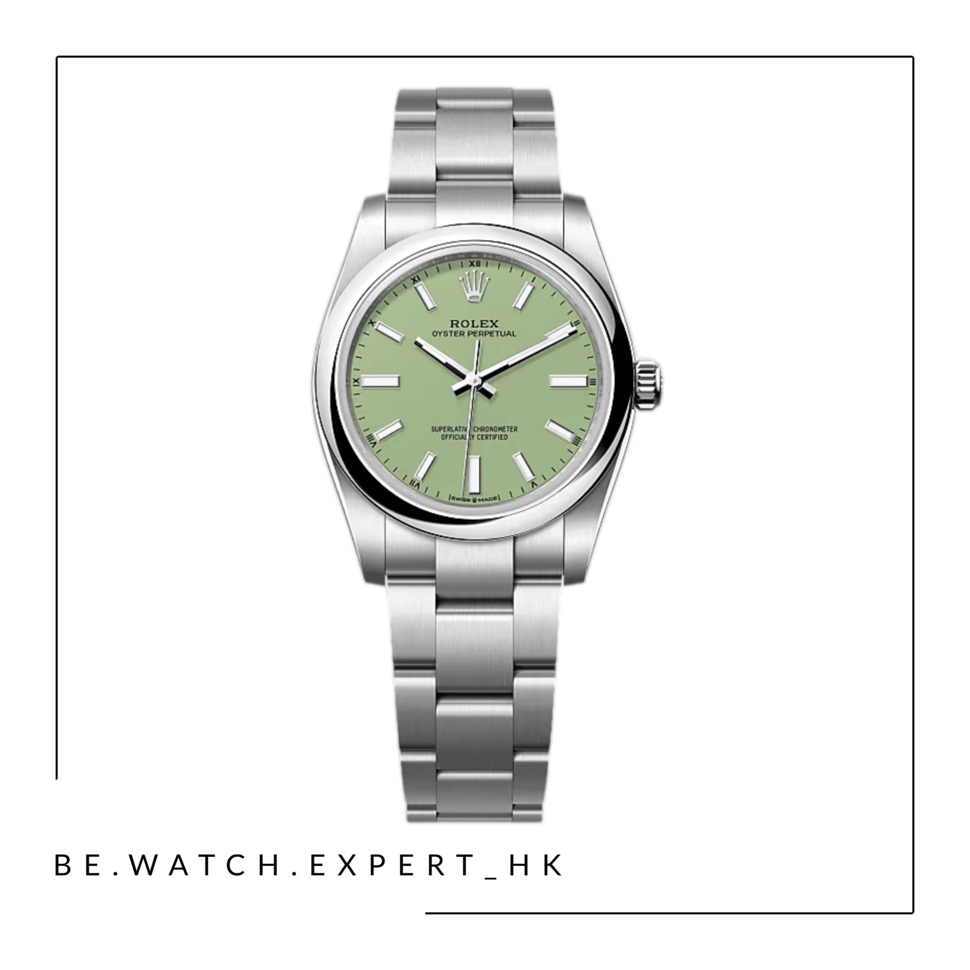 腕錶搭配開心果綠色錶面及蠔式(Oyster)錶帶