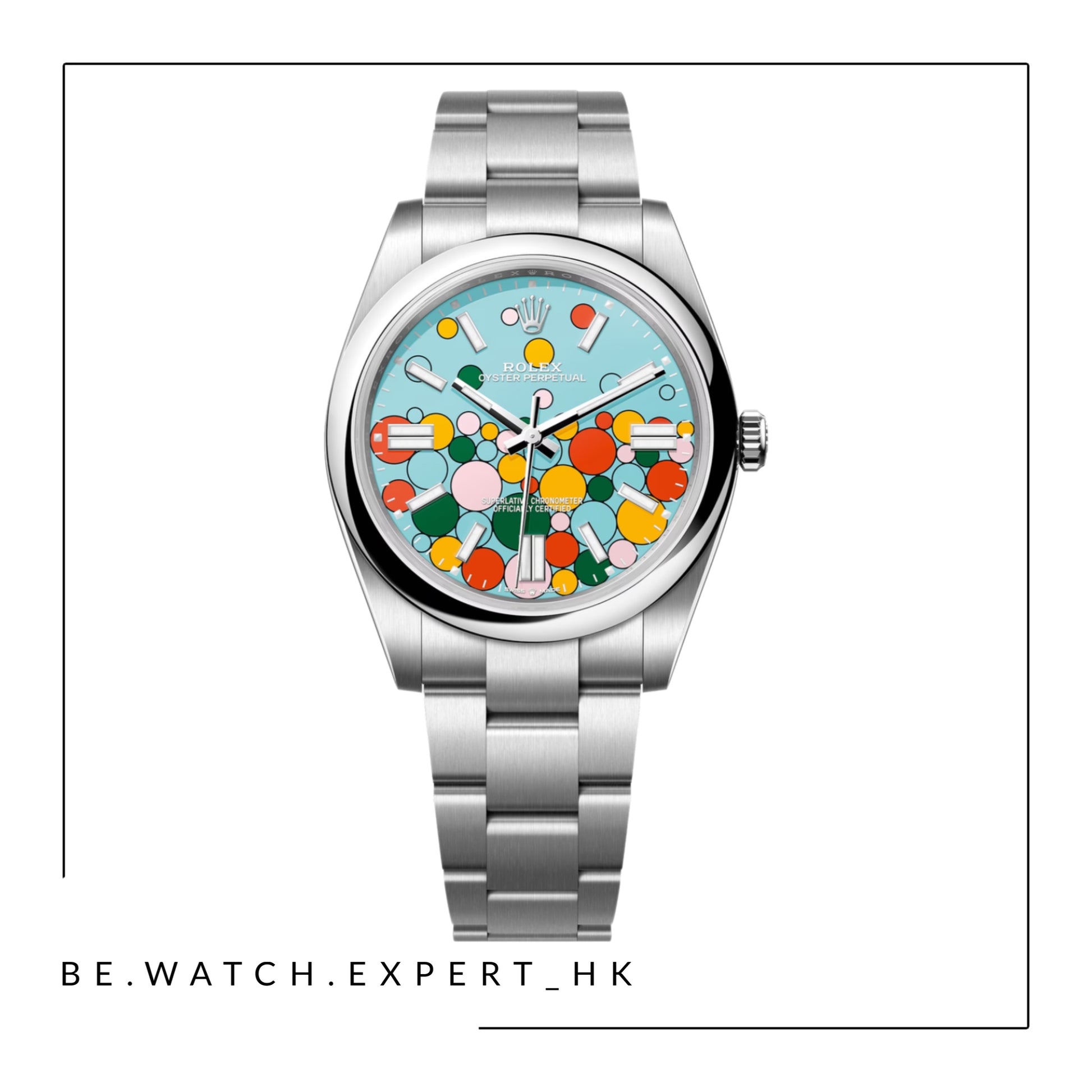 搭配綠松石藍色慶典圖案錶面及蠔式(Oyster)錶帶