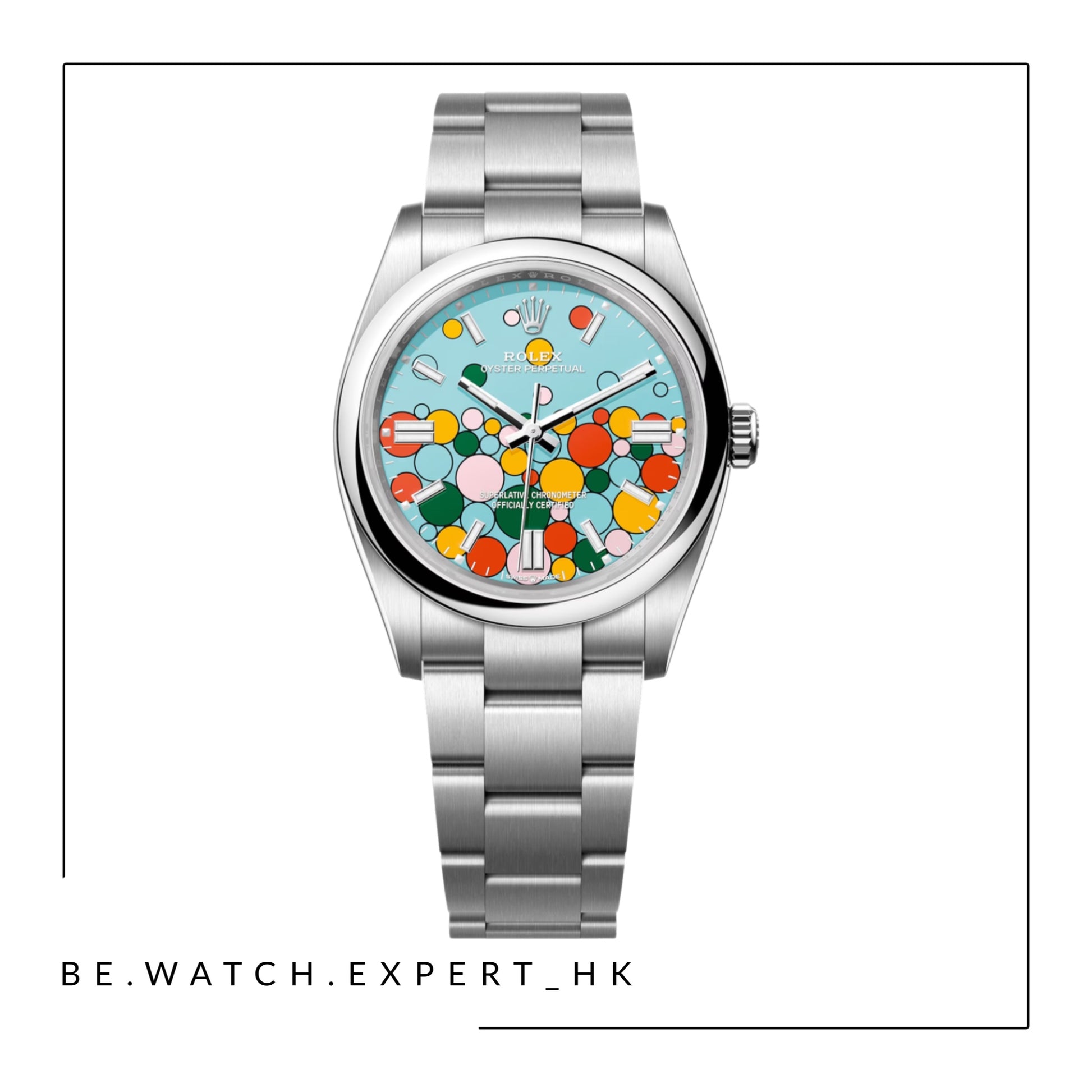 搭配綠松石藍色慶典圖案錶面及蠔式(Oyster)錶帶