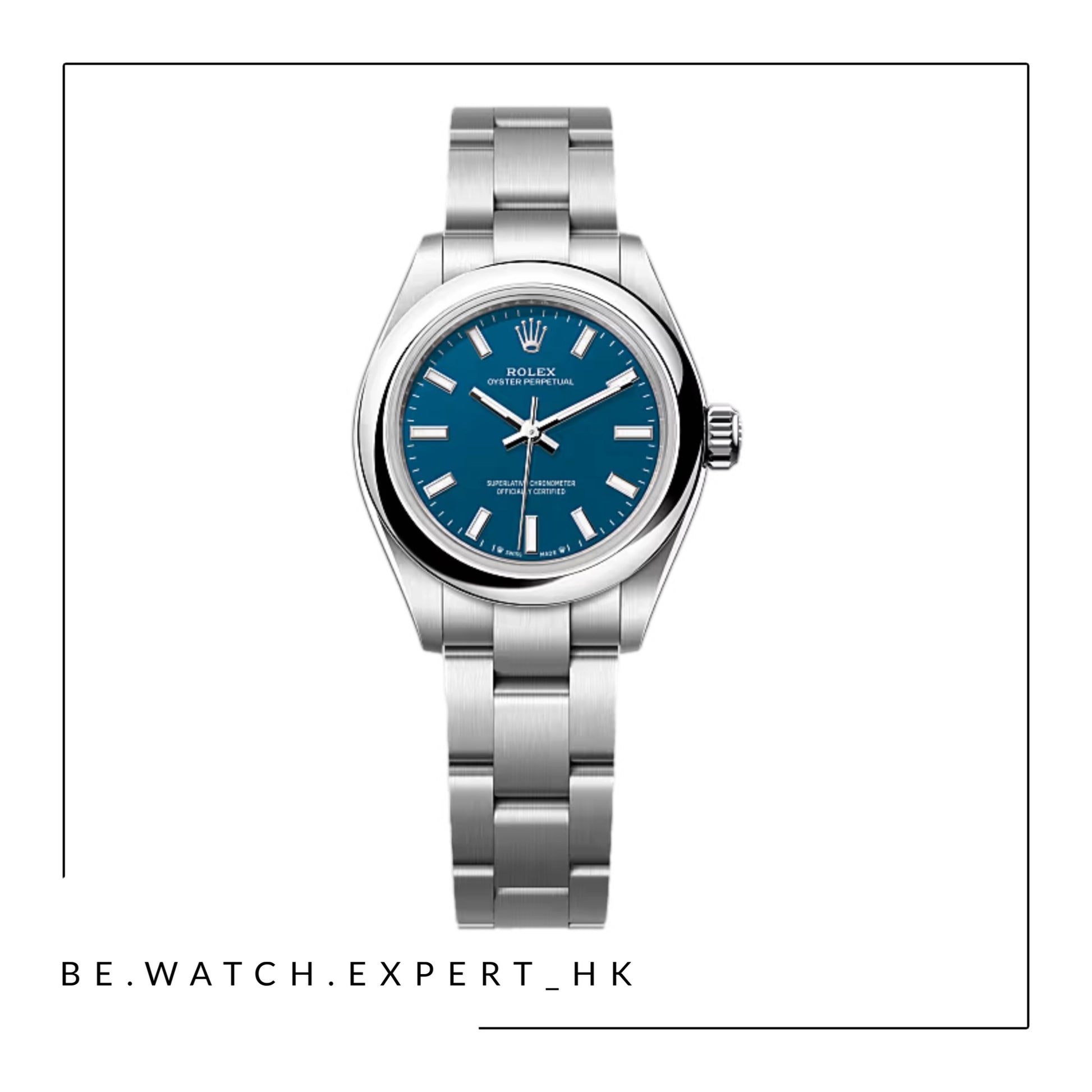 腕錶搭配藍色錶面及蠔式(Oyster)錶帶