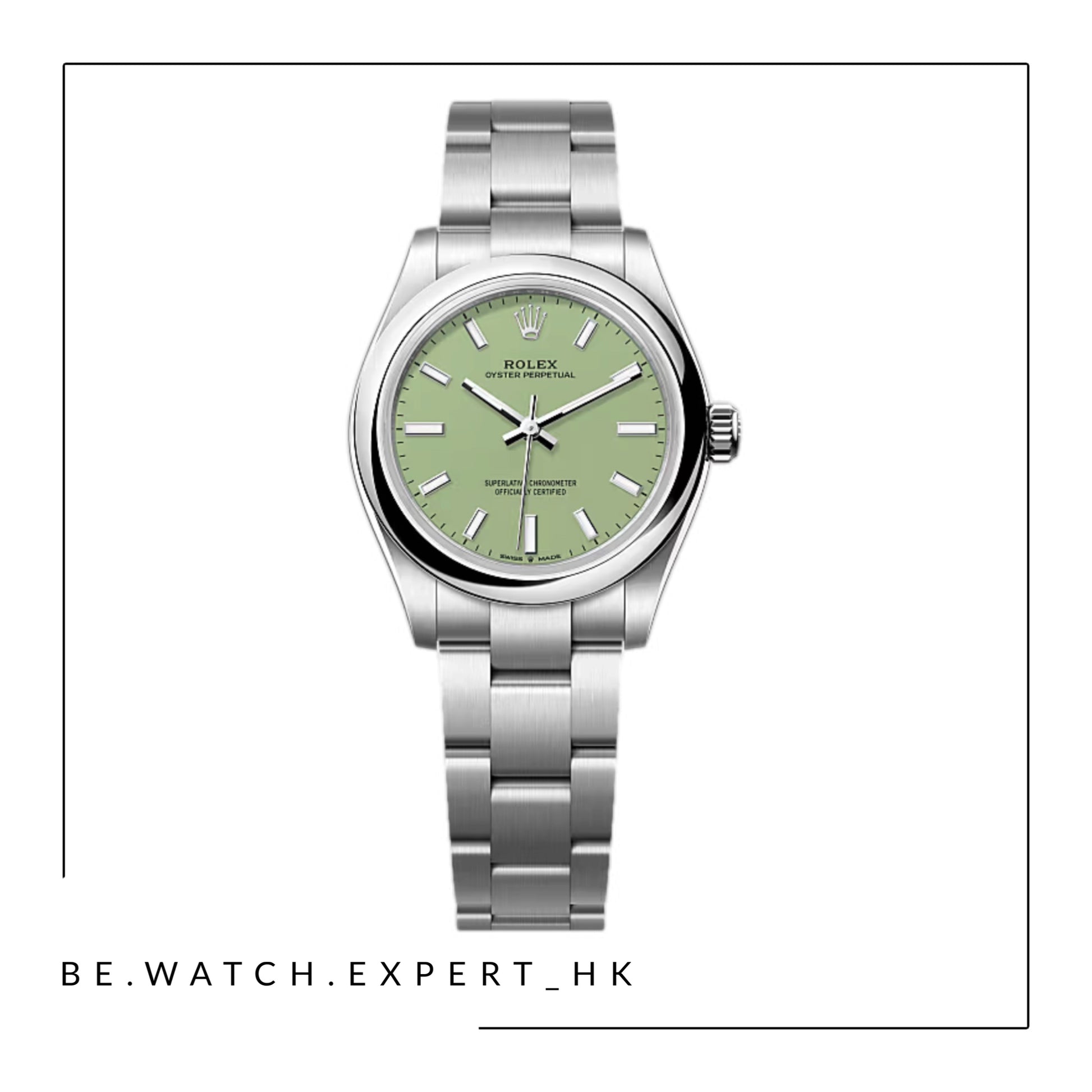腕錶搭配開心果綠色錶面及蠔式(Oyster)錶帶