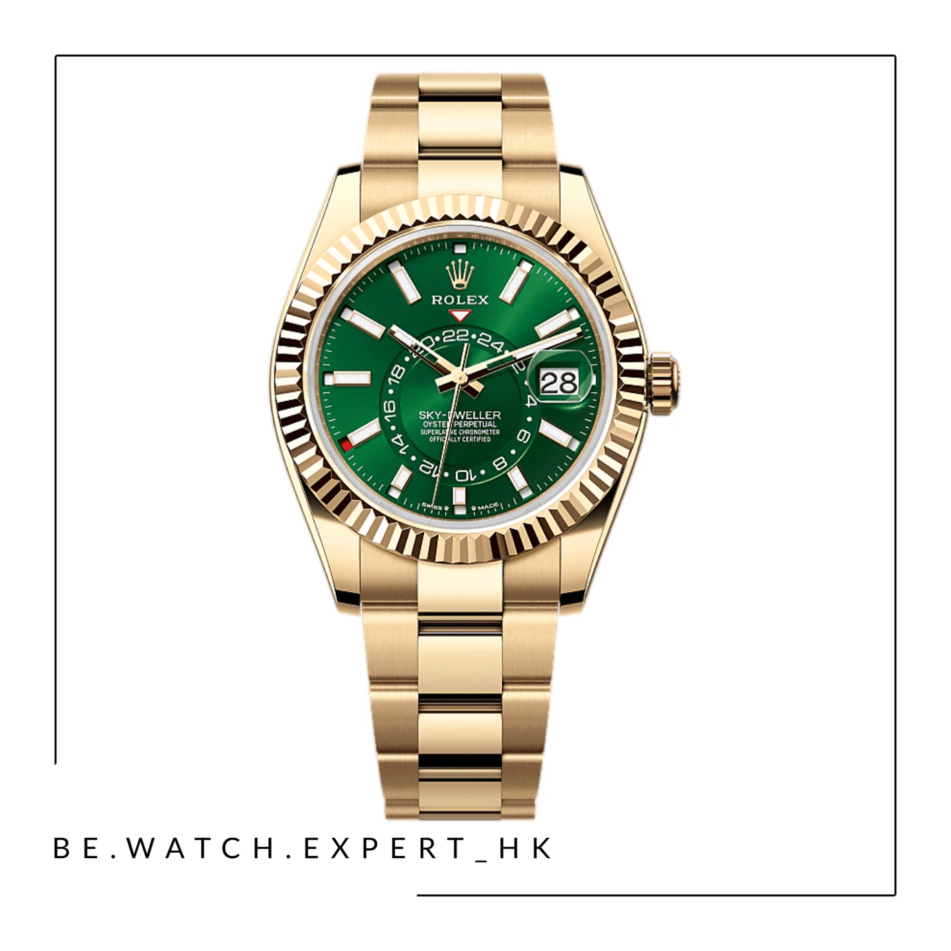 18K黃金款,搭配亮綠色錶面及蠔式(Oyster)錶帶